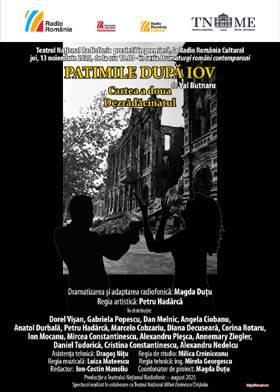 Teatrul Național Radiofonic prezintă în premieră, joi, 13 noiembrie 2025, de la ora 19.00, la Radio România Cultural, PATIMILE DUPĂ IOV de Val Butnaru. Cartea a doua - Dezrădăcinatul. Dramatizarea și adaptarea radiofonică: Magda Duțu. Regia artistică: Petru Hadârcă. În distribuție: Dorel Vișan, Gabriela Popescu, Angela Ciobanu, Dan Melnic, Anatol Durbală, Petru Hadârcă, Marcelo Cobzariu, Diana Decuseară, Corina Rotaru, Ion Mocanu, Alexandru Pleșca, Mircea Constantinescu, Annemary Ziegler, Daniel Tudorică, Cristina Constantinescu, Alexandru Nedelcu. Asistența tehnică: Dragoș Niță. Regia de studio: Milica Creiniceanu. Regia muzicală: Luiza Mateescu. Regia tehnică: inginer Mirela Georgescu. Redactor: Ion-Costin Manoliu. Coordonator de proiect: Magda Duțu.