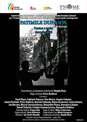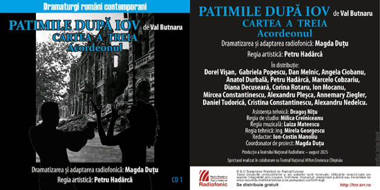 Teatrul Național Radiofonic prezintă în premieră, joi, 27 noiembrie 2025, de la ora 19.00, la Radio România Cultural, PATIMILE DUPĂ IOV de Val Butnaru. Cartea a treia - Acordeonul. Dramatizarea și adaptarea radiofonică: Magda Duțu. Regia artistică: Petru Hadârcă. În distribuție: Dorel Vișan, Gabriela Popescu, Angela Ciobanu, Dan Melnic, Anatol Durbală, Petru Hadârcă, Marcelo Cobzariu, Diana Decuseară, Corina Rotaru, Ion Mocanu, Alexandru Pleșca, Mircea Constantinescu, Annemary Ziegler, Daniel Tudorică, Cristina Constantinescu, Alexandru Nedelcu. Asistența tehnică: Dragoș Niță. Regia de studio: Milica Creiniceanu. Regia muzicală: Luiza Mateescu. Regia tehnică: inginer Mirela Georgescu. Redactor: Ion-Costin Manoliu. Coordonator de proiect: Magda Duțu.